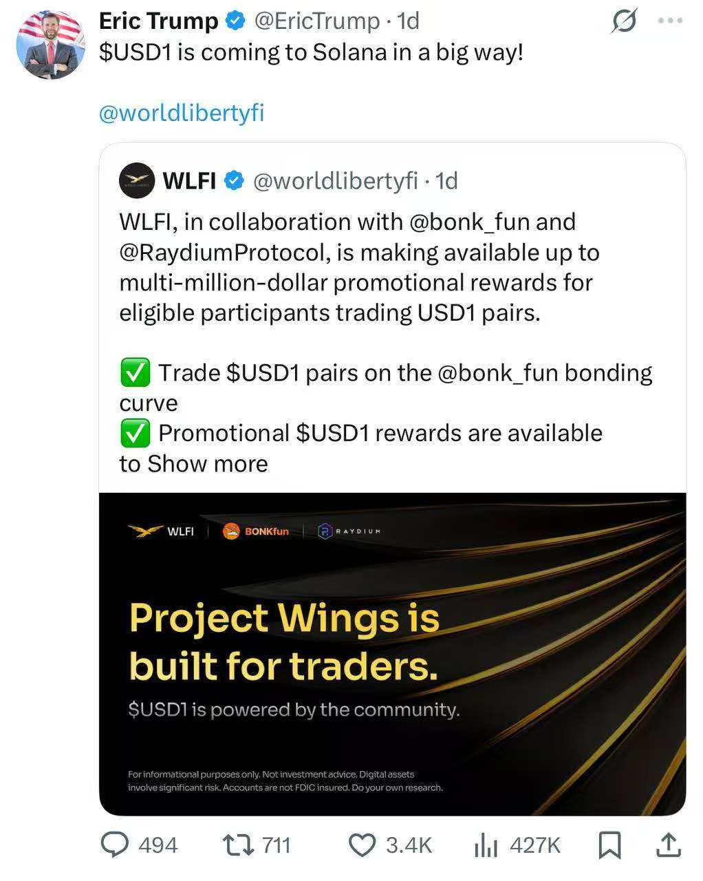美国总统唐纳德·特朗普的儿子埃里克·特朗普(Eric Trump)宣布,World Liberty Financial($WLFI)将与 BONK (@bonk_inu) , BONK.fun 和 Raydium合作,携带 $USD1 登陆 Solana。 在 BONK.fun 上交易 $USD1 pair,即有机会赢取超过 100 万美元的奖励! 别忘了关注他们的全新 Twitter 中文平台,获取更多独家Web3资讯与深度分析! https://x.com/bonk_fun_zh