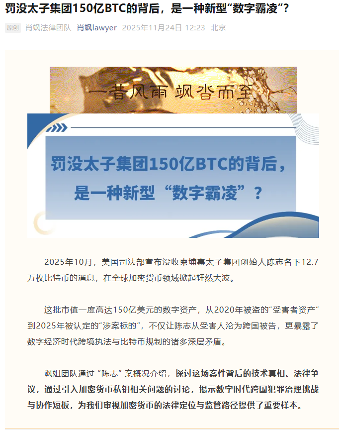 025年10月美国司法部对柬埔寨太子集团陈志名下12.7万枚比特币的没收决定,引发全球法律界对数字时代新型霸凌行为的深度思考。知名数字金融法律师肖飒指出,此案暴露出美国正通过技术、法律与金融的复合手段,构建一种前所未有的"数字霸凌"体系。