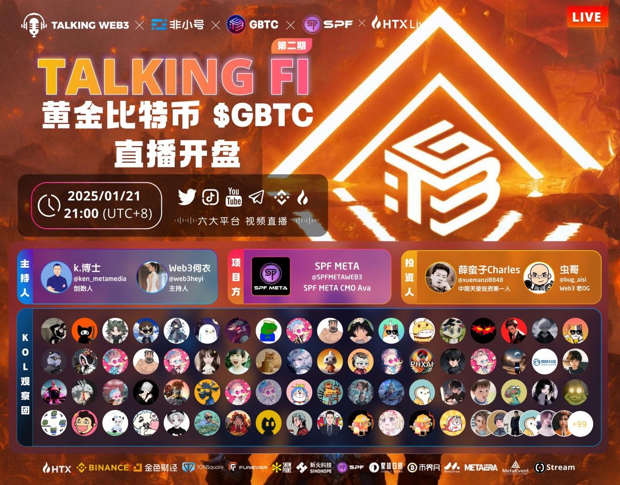 2025年1月21日晚,由GBTC和Talking Web3共同主办的《TalkingFi》第二期直播如期上线,在X、币安、火币、YouTube、TikTok、Telegram等六大平台吸引了超17万观众,更有上百位华语知名KOL参与进来,共同见证了黄金比特币(GBTC)的首次亮相。本次活动不仅为链游领域带来了一场内容丰富的行业盛宴,还记录了GBTC在热币Hotcoin交易所的惊艳开盘表现,最高涨幅高达9000倍,再次验证了去中心化项目的强劲市场潜力。